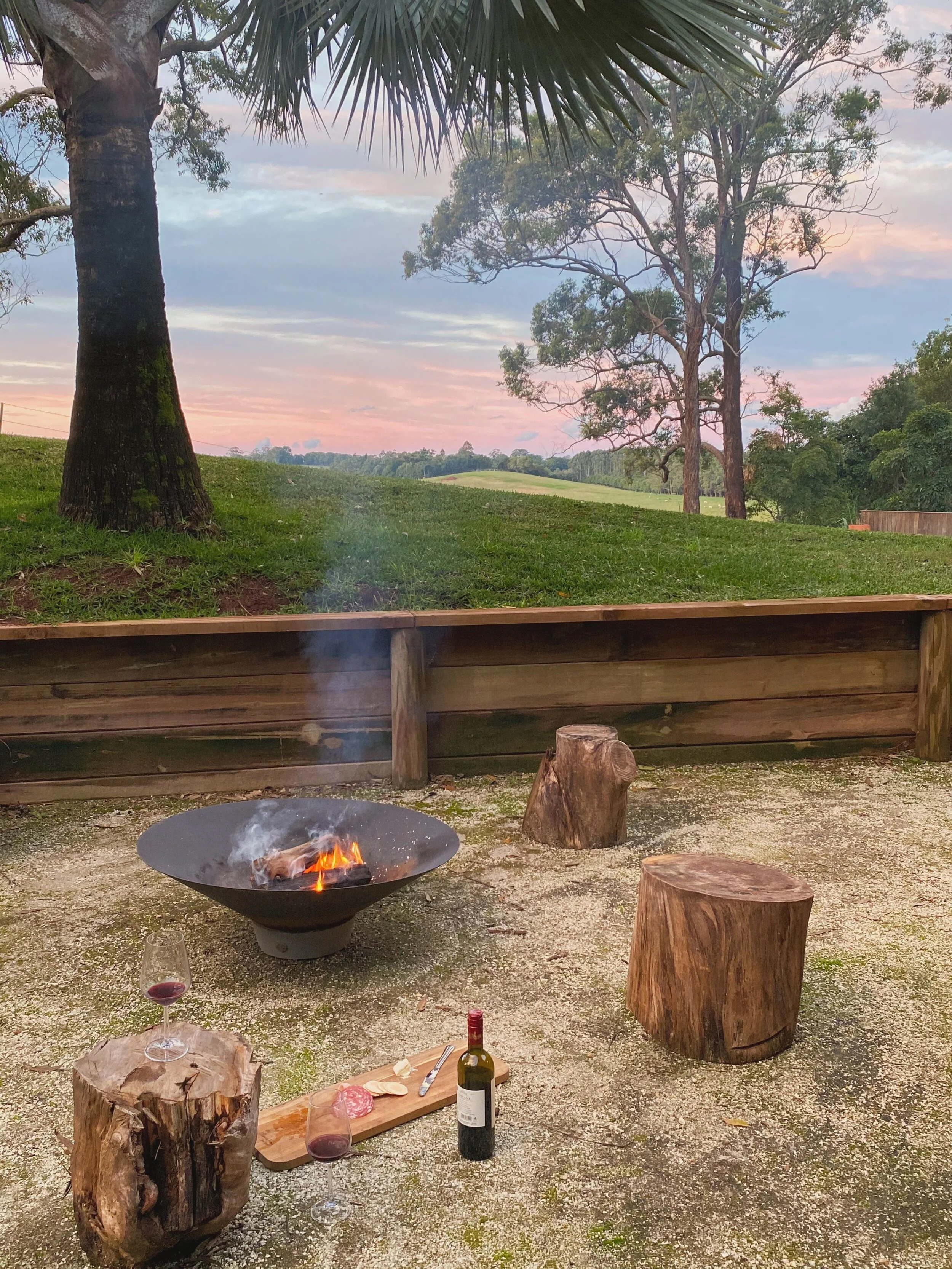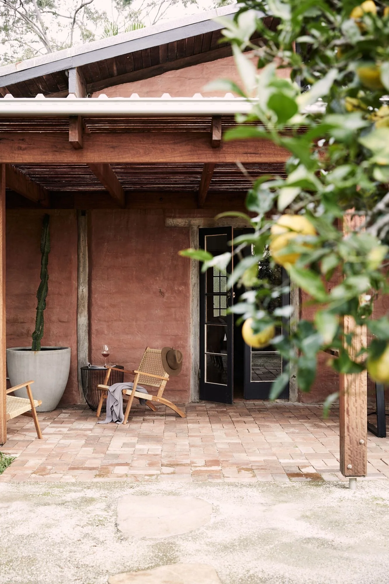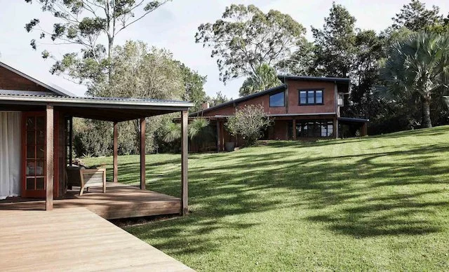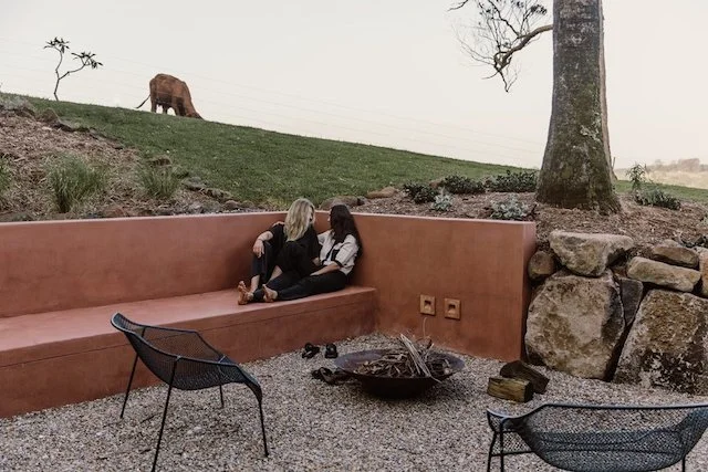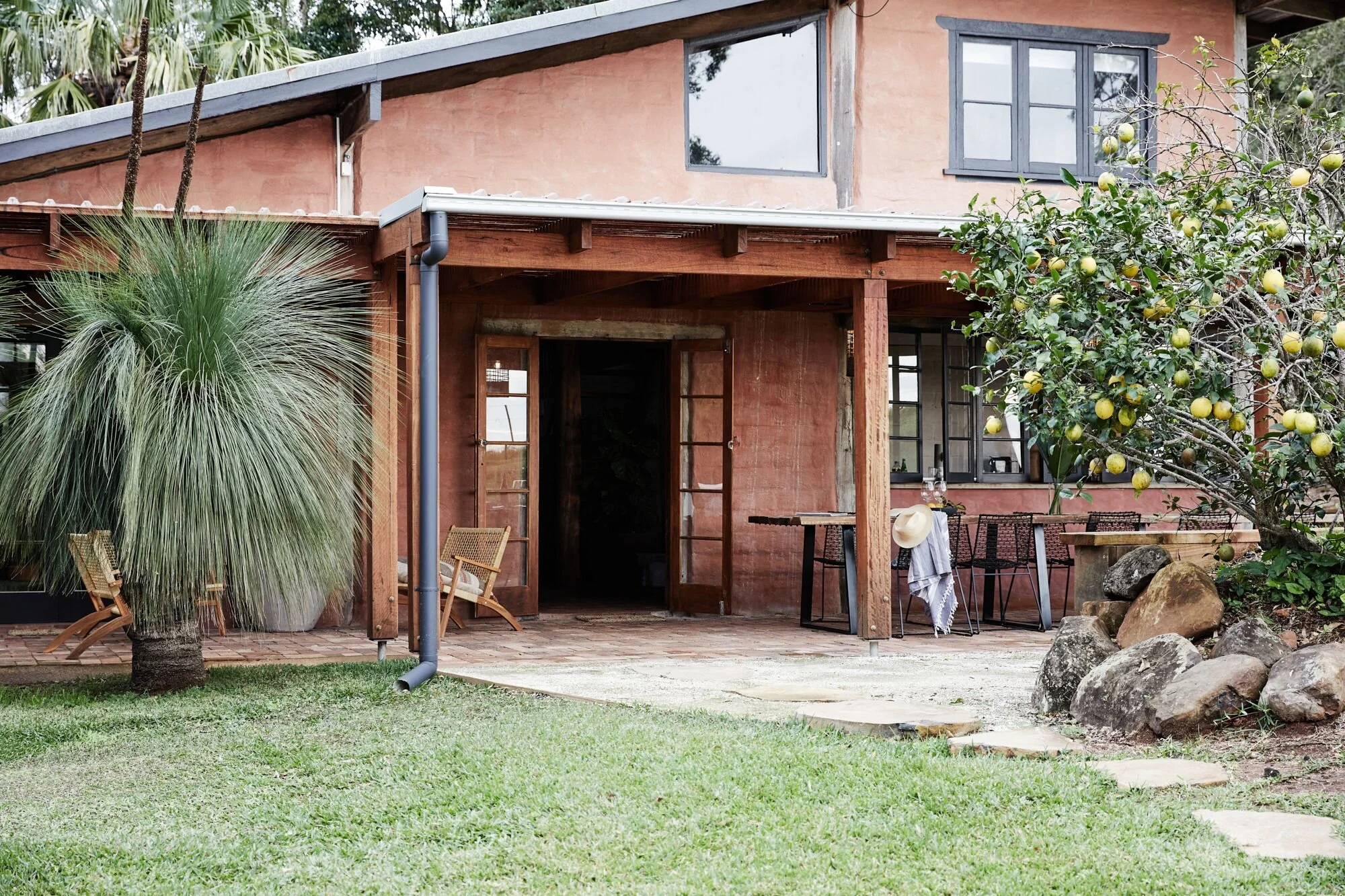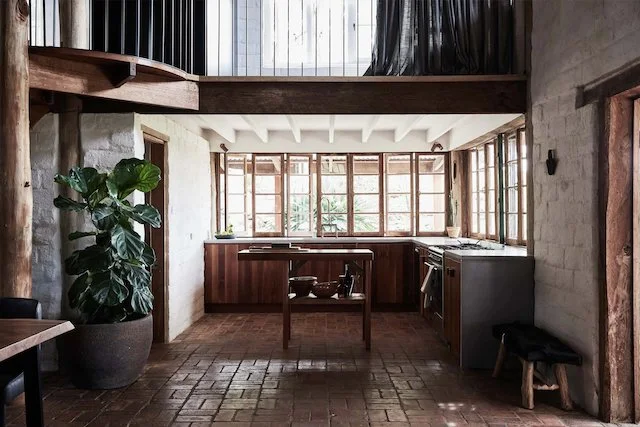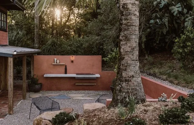 This home located in Byron Bay a Spanish style countryside casa, stone and brickwork throughout, the spaces are open planned and warm, there’s beautiful filtered light throughout and a gorgeous lemon tree at the entryway. It’s situated on a large property and is multi-zoned; outdoor entertaining, dining area and fire pit.