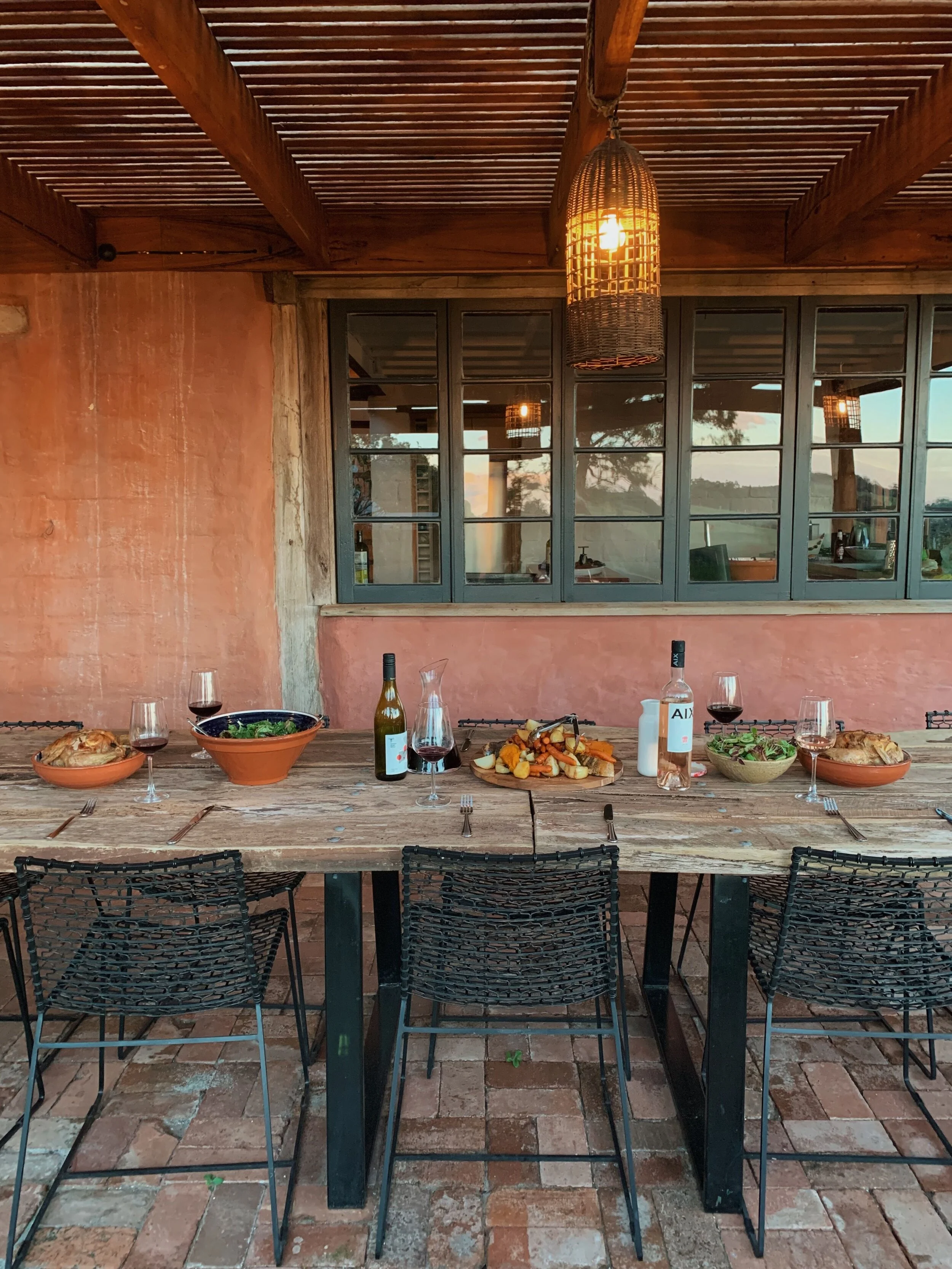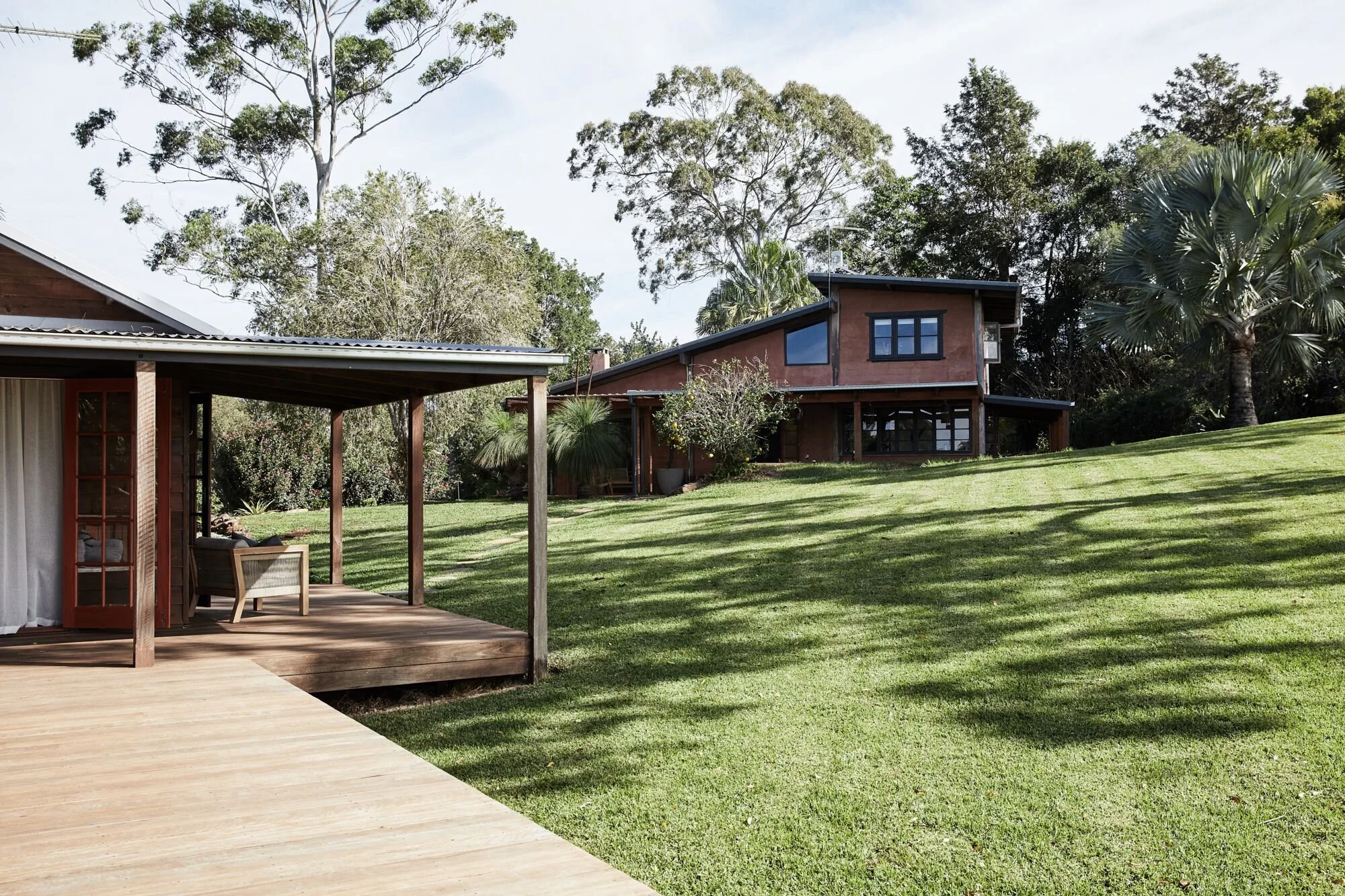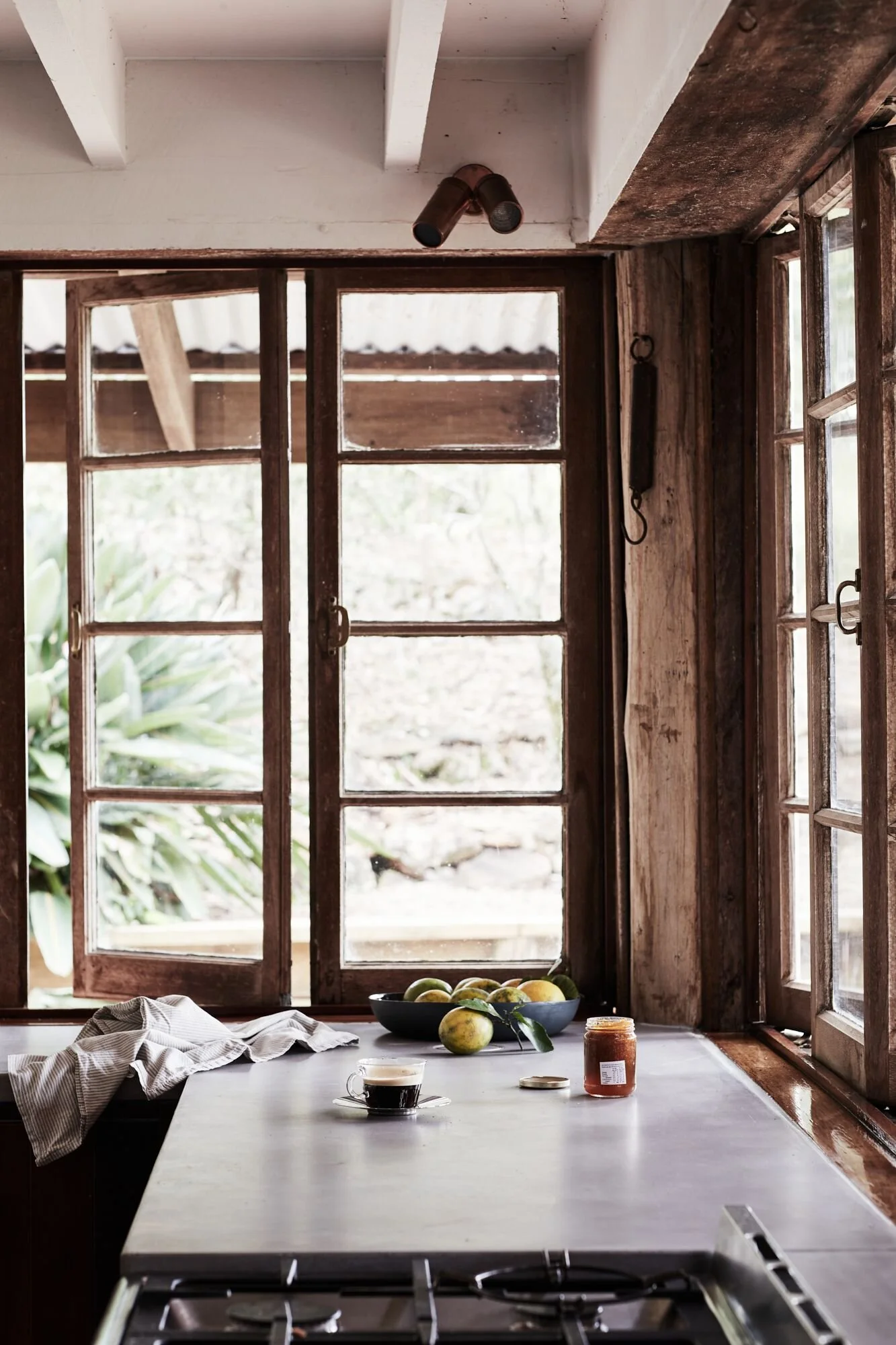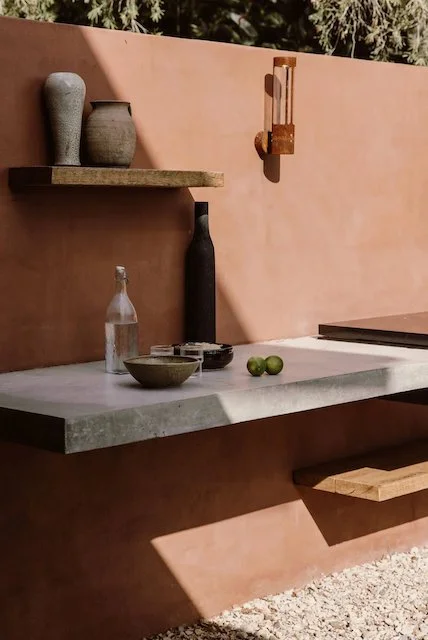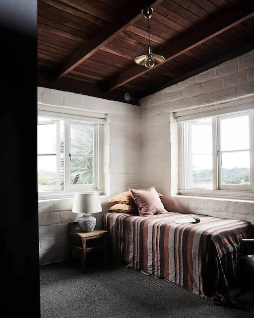 This home located in Byron Bay a Spanish style countryside casa, stone and brickwork throughout, the spaces are open planned and warm, there’s beautiful filtered light throughout and a gorgeous lemon tree at the entryway. It’s situated on a large property and is multi-zoned; outdoor entertaining, dining area and fire pit.