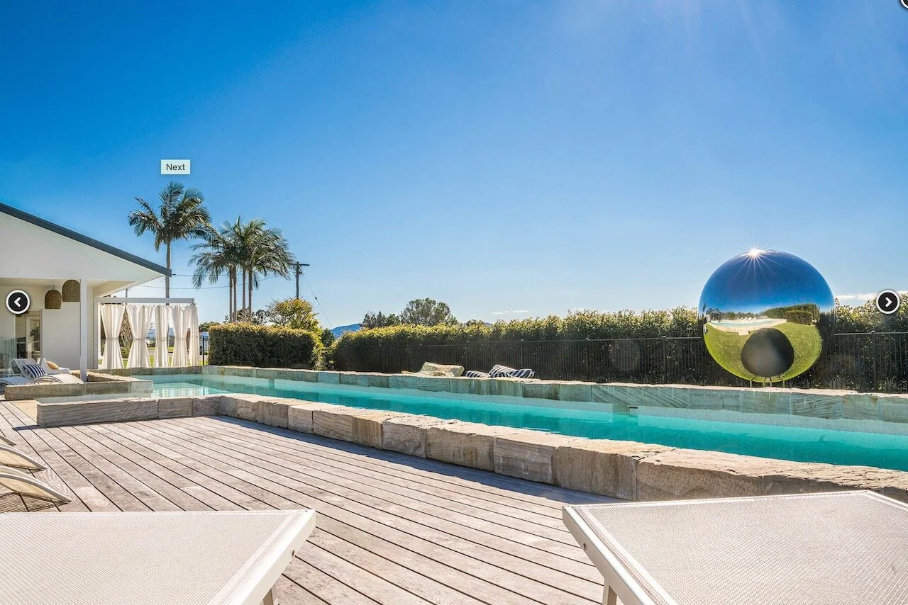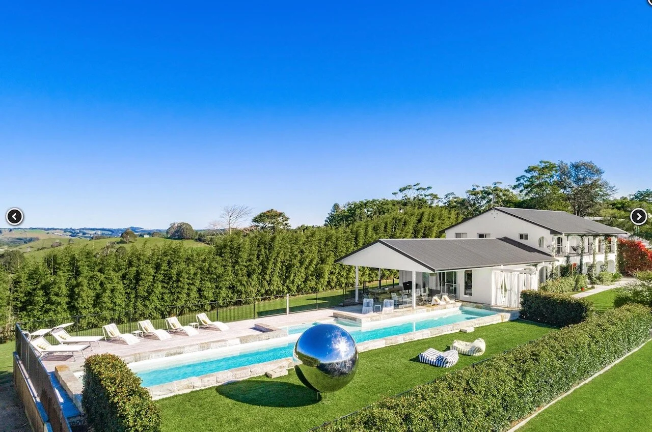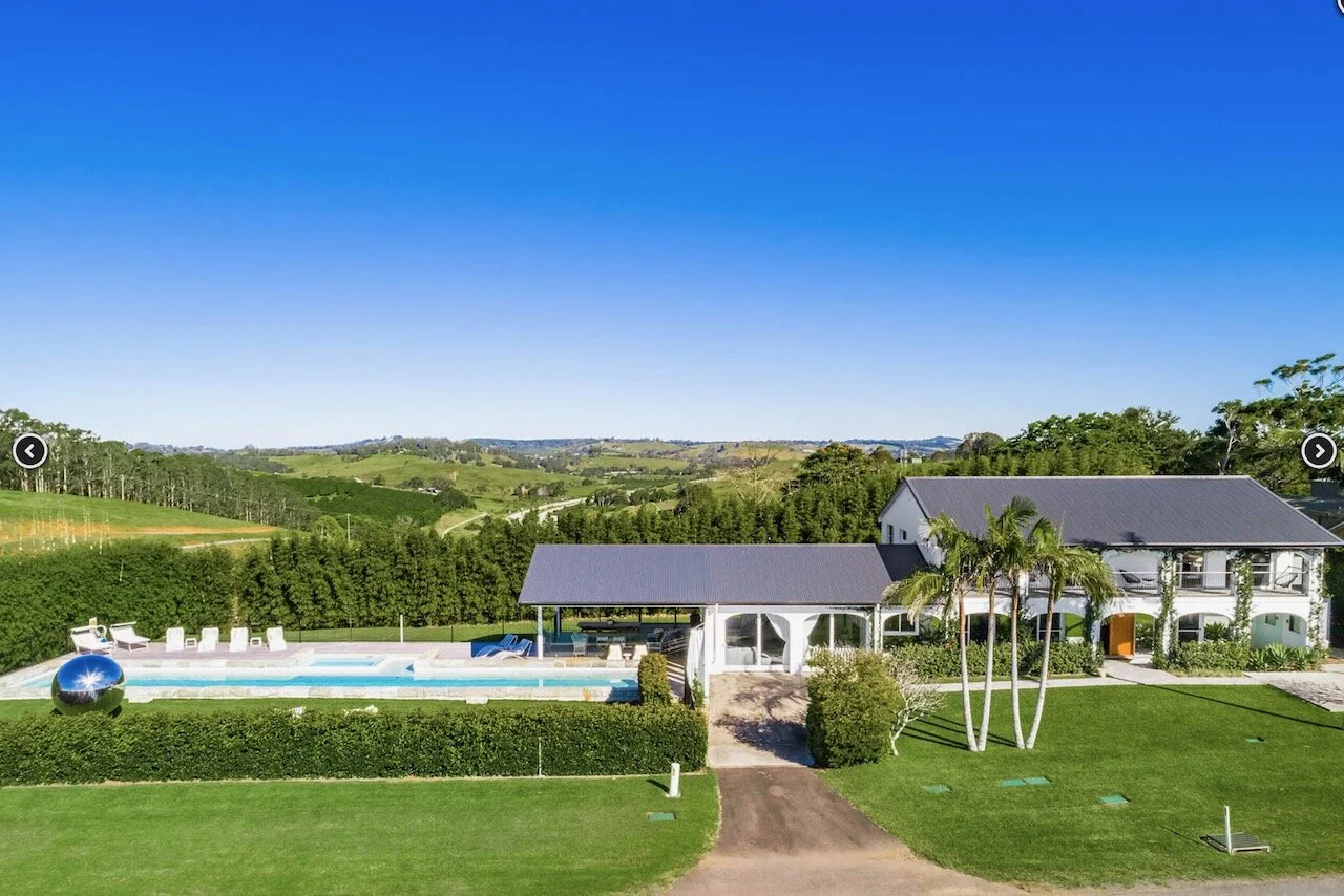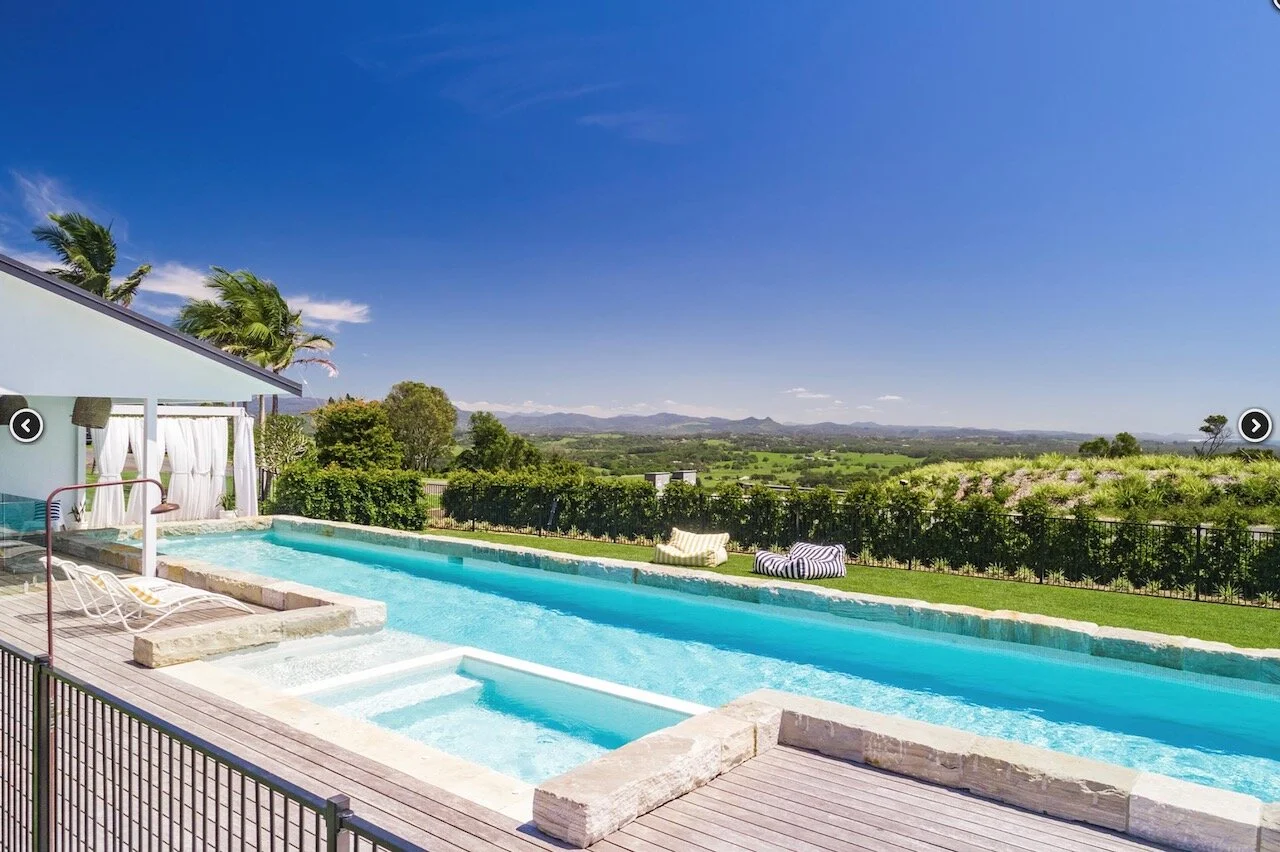 Sundays is a proud contemporary Mediterranean styled farmhouse. It is positioned above Byron bay and has spectacular views of the below town and ocean to the front of the house and hinterland behind it. The huge pool is the statement of the property. Surrounding the home are arches. The space is bright and beach focused