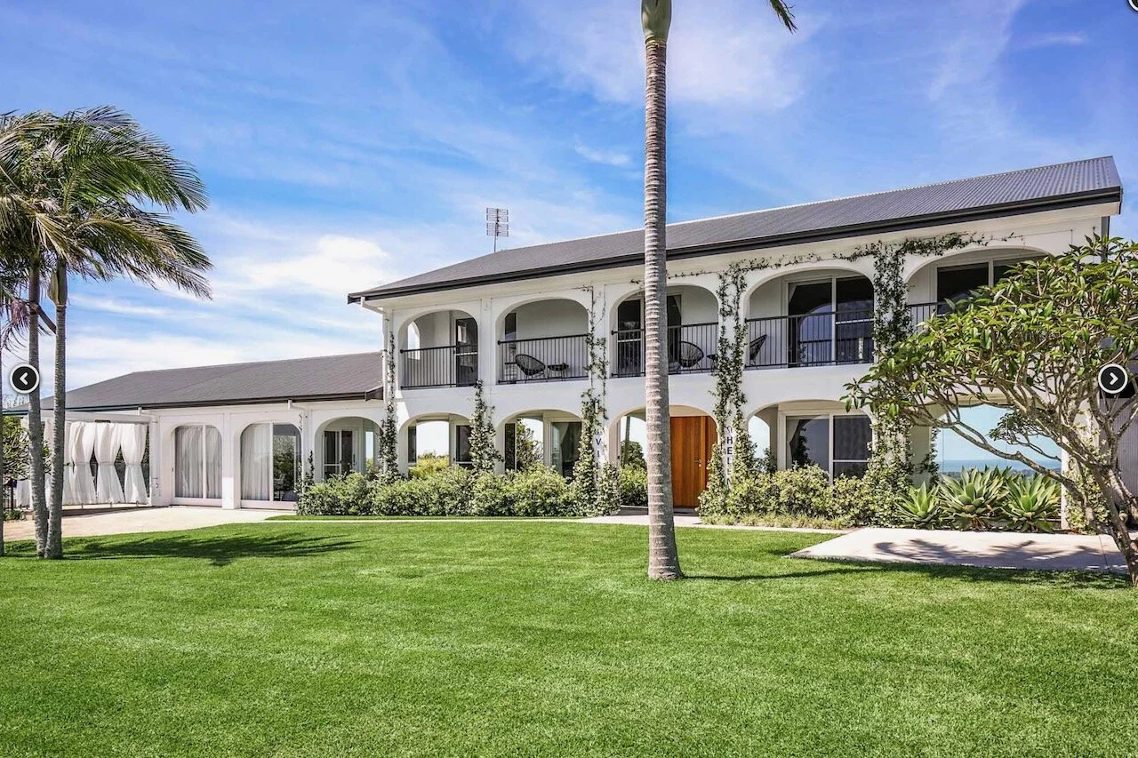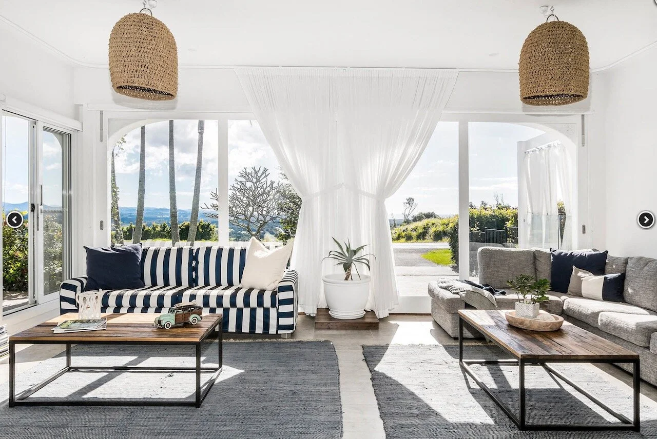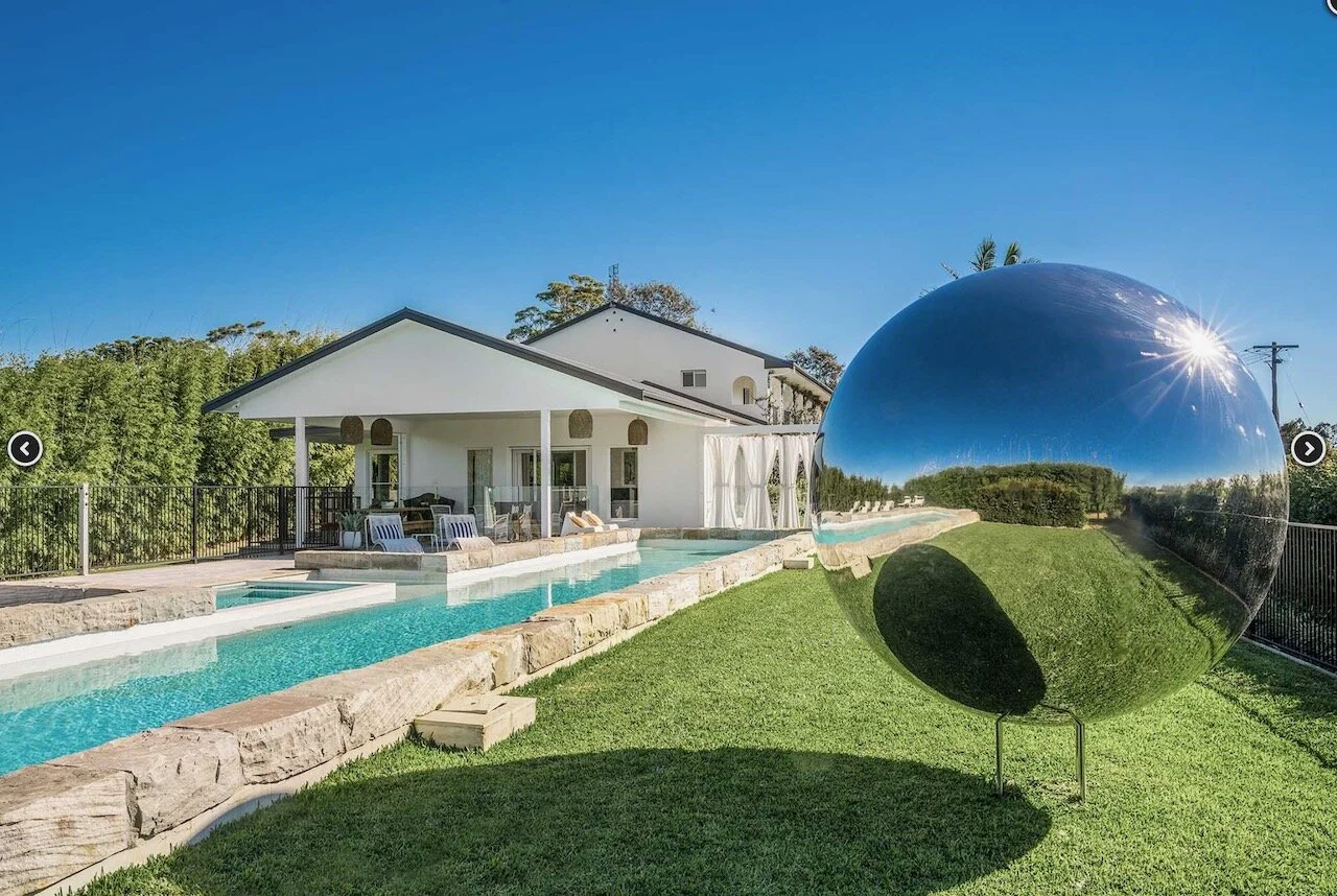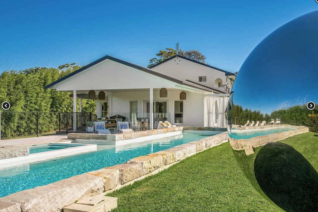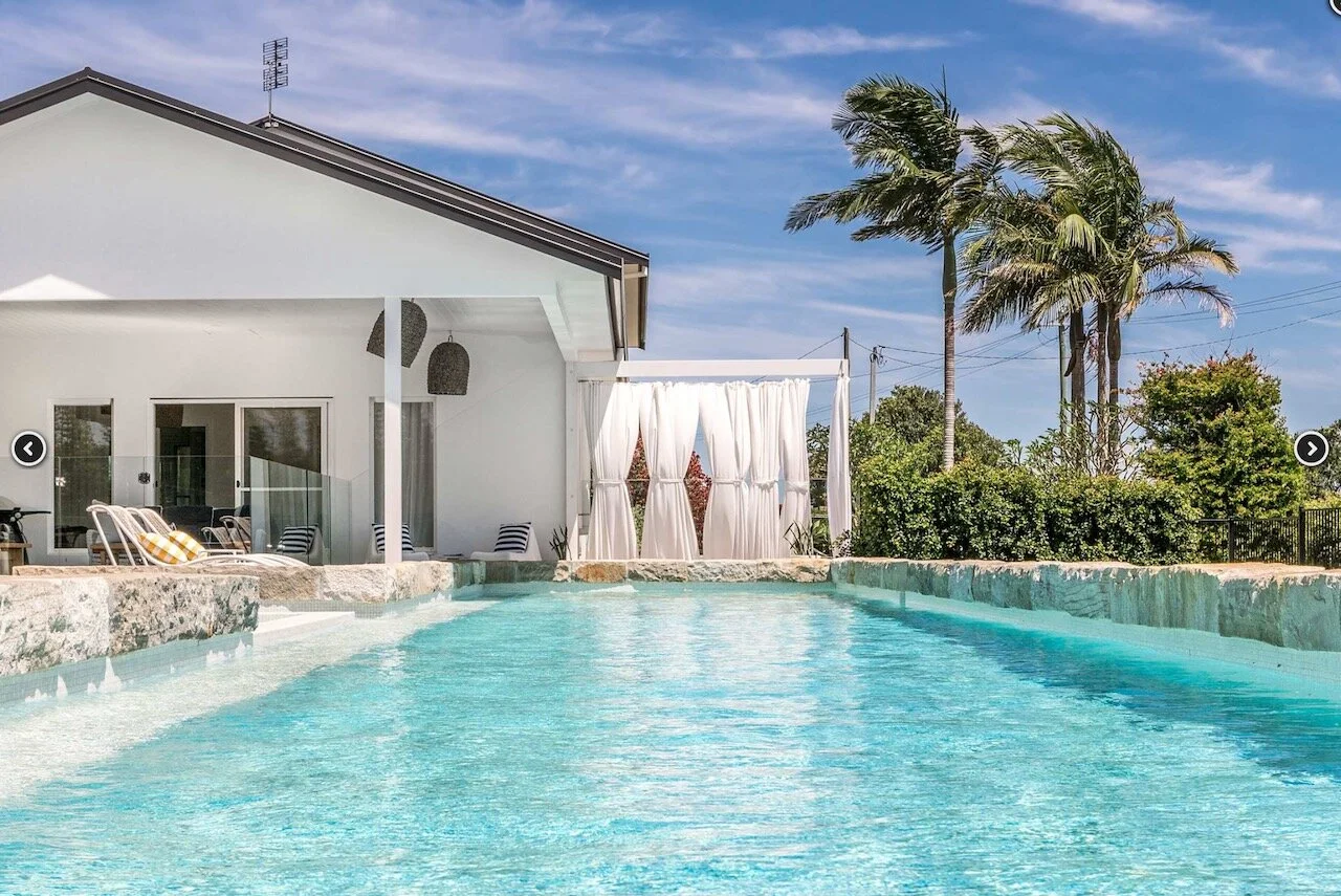 Sundays is a proud contemporary Mediterranean styled farmhouse. It is positioned above Byron bay and has spectacular views of the below town and ocean to the front of the house and hinterland behind it. The huge pool is the statement of the property. Surrounding the home are arches. The space is bright and beach focused